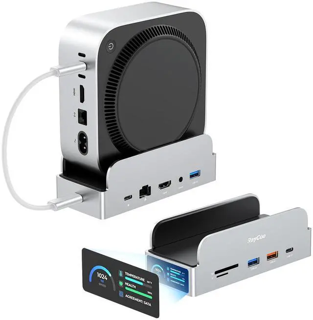 M4 (2024): Vertical stand dock saves up to 45% desk space and features 5 smart UI displays (boot screen, power status, M. 2 SSD info, data ports, HDMI connection). Streamlined design gives easy access to the bottom ports without lifting the device.