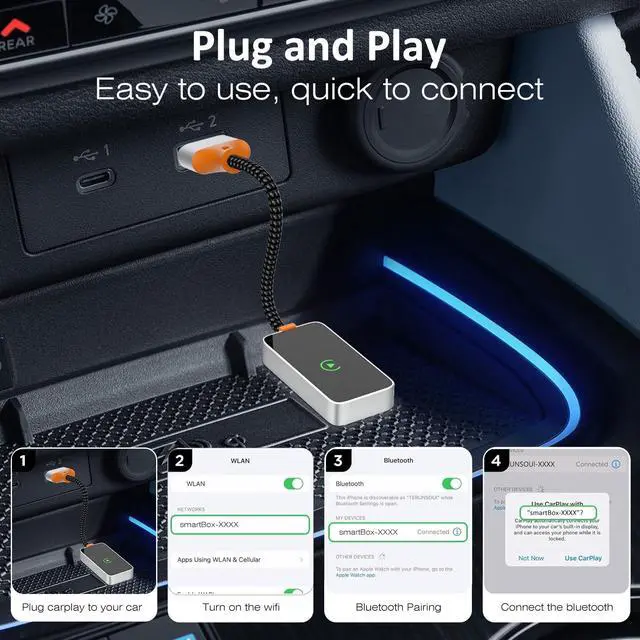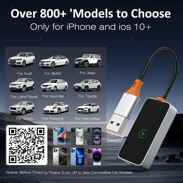 Plug-and-Play SimplicityDitch the hassle of tangled wires and embrace the convenience of wireless CarPlay. Simply plug our adapter into your car's USB port, after the first successful connection, and it will automatically pair with your iPhone 10 or later device, ready to go in seconds. No waiting, no setup just pure driving bliss. ^^ Broad CompatibilityCompatible with any vehicle with a factory-installed wired Apple CarPlay, our adapter makes upgrading to wireless functionality easy and efficient, without needing expensive modifications or replacements for your car. (If your car DOES NOT HAVE a built-in Apple CarPlay system, please DO NOT purchase.