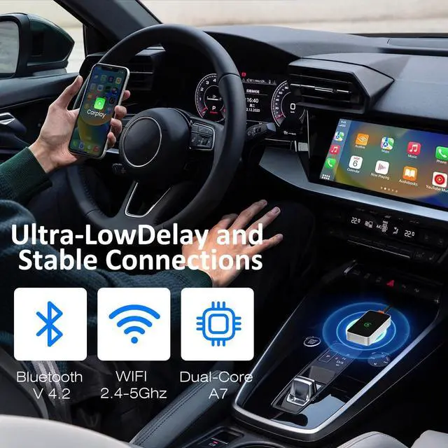) ^^ Wireless Carplay AdapterInstantly transform your vehicle's wired CarPlay into a wireless system! Enjoy navigation, music, Siri, calls, and messaging without the hassle of tangled cables. Maintain full CarPlay features and factory car controls for a cleaner, more comfortable drive. ^^ Enhanced PerformanceRayCue CarPlay adapter features a 2024 advanced core chip, delivering a powerful, rapid, and stable wireless connection while reducing interruptions and delays during use to ensure real-time synchronization and responsiveness between your iPhone and your car's display screen when using wireless CarPlay. ^^ Broad CompatibilityCompatible with any vehicle that has a factory-installed wired Apple CarPlay, our adapter makes upgrading to wireless functionality easy and efficient, without the need for expensive modifications or replacements for your car.
