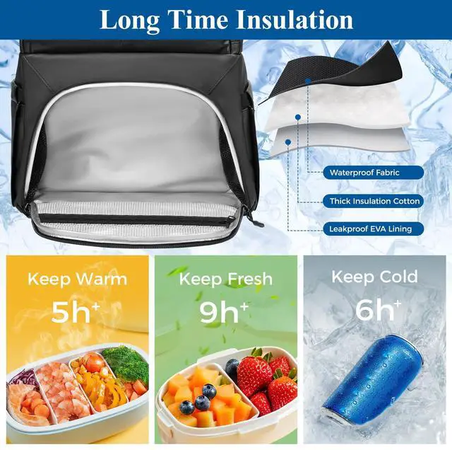 Larger Cooler Compartment: This large lunch backpack for men work has a dedicated lunch compartment place for 6 pcs of 32 oz lunch boxes, 20 beverage cans, and some fruit. 3-layer insulation (Leakproof EVA, Padded Cotton, Waterproof PU Coating) keeps food warm / cold for 5-6 hours. 2 inner mesh pockets hold drinks, while a waterproof zipper pocket for cutlery is easy to clean and prevents odors. Perfect for busy professionals looking for a convenient, hassle-free lunch solution