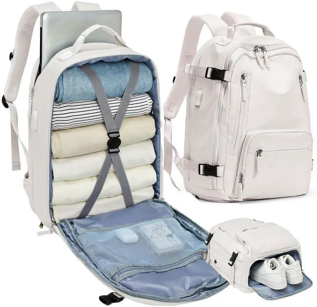 Travel Backpack for Women Men, Waterproof Carry on Backpack for Flight Approved Personal Item Bag, Business Laptop Backpack with USB Charging for Hiking Gym with Shoe Compartment Casual Daypack White