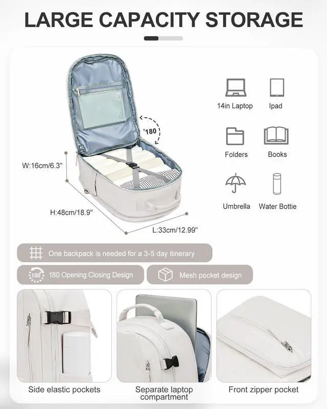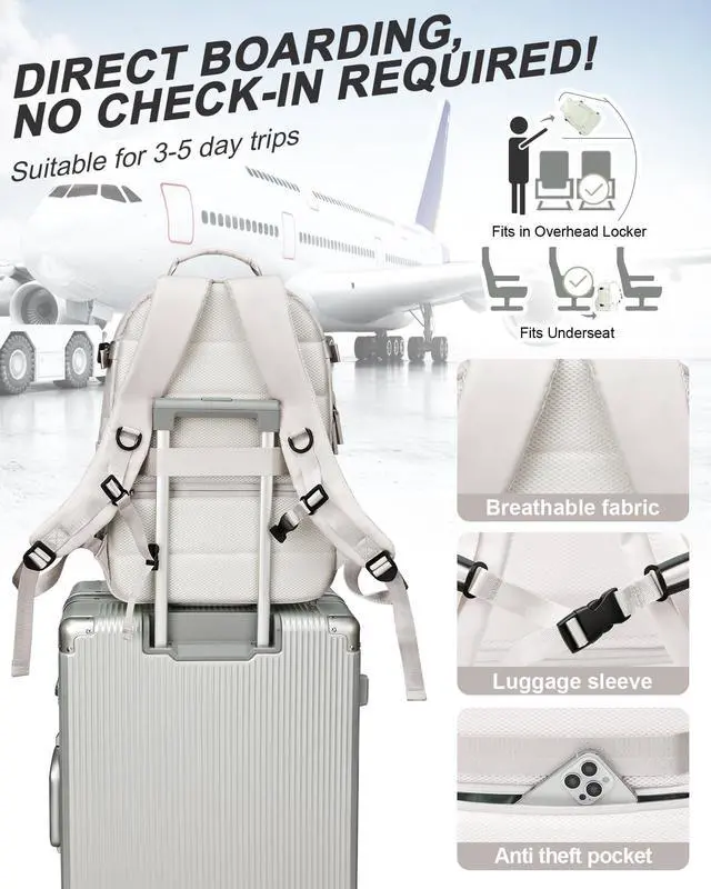 [(Flight-approved Travel Backpack)] Size:17.72*13.39*5.9 inch. Weight: 2Lb/0.9Kg. Fits most airline regulations. Easy to put in luggage rack or under seats. Our backpack is not only perfect for travel, but also for everyday use. The trolley sleeve allows you to conveniently slide it over the handle of your luggage for easy transport.