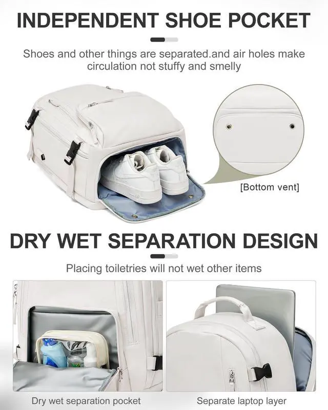 [(Separate Shoe Compartment Design & Wet Bag)] Main pocket x 2, laptop compartment x 2 (fit for a 13" tablet and 14" laptop respectively), and many other pockets for different purposes. The wet bag is made of high density water resistant material can help you to separate dry items and wet items,if you have wet clothes or towel,you can put it in wet bag. A separate shoe compartment can help you carry and keep your shoes better in your travel bag.