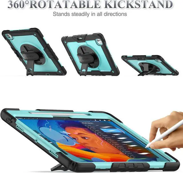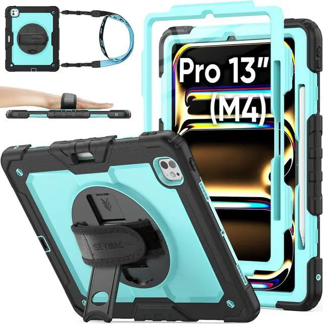 SEYMAC stock Case for iPad Pro 13 inch Case 2024 (M4), Shockproof Protective with Pencil Holder, Screen Protector, 360deg Rotate Stand, Adjustable Hand Strap, Shoulder Strap, SkyBlue