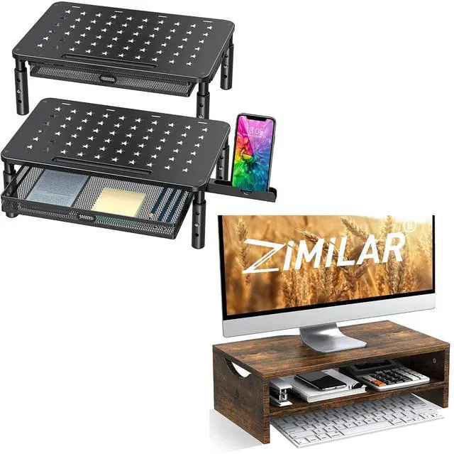Monitor Stand Riser with Metal Mesh Drawer, Height Adjustable Monitor Riser with Phone Holder+Zimilar Monitor Stand Riser, 2 Tiers Laptop Computer Monitor Riser
