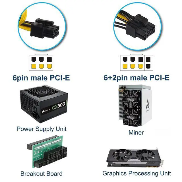 Length: 20 inch / 50 centimeters; ^^ Compatible with PSU Breakout Board that for use with server power Supply 750W/ 1200W/ 1400W/ 1500W and more - DPS-1200FB, HSTNS-PD11, HSTNS-PL11, HSTNS-PL18, 438202-002, 441830-001, HSTNS-PL33, 684529-001, 684530-201, 704604-001, 684532-B21, 5117778-001, 506821-001, DPS-1200FB DPS-800GB DPS-1200QB PS-2751-5Q PS-2751-LF-1F HSTSN-PL12 DPS-700LB PS-2112-5L DPS-750RB and more A cost-effective solution for Ethereum, Bitcoins, Ripple, Litecoin, Z-coins and other alt-currencies Miners; ^^ End 1: 6 +2pin male PCI-E connector (to miner or GPU); End 2: 6 pin male PCI-E connector (to PSU or breakout board); Connect a standard 6-pin PCI Express power connection on the Power Supply to 8-pin ATI and NVidia video cards; ^^ Compatible with 6 Pin & 8 Pin graphics cards from popular manufacturers from ASUS, ASRock, Radeon, Sapphire, and Gigabyte; ^^ The cables are designed to power the GPUs used in Ethercoin/Litecoin mining rigs. They can be also used for powering Bitcoin miners such as Antminer R4/S7/S9, Avalon A6, or SP2x.