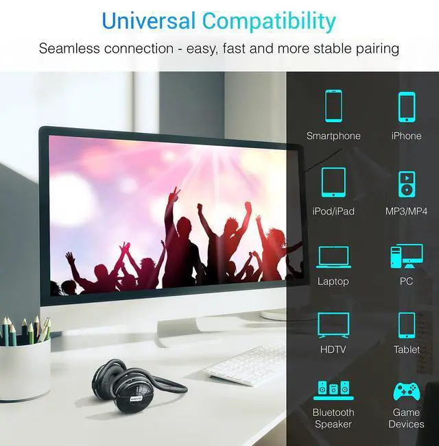 Compatible with Bluetooth enabled music players & A2DP enabled devices such as iPad, iPhone, iPod touch, Android Smart Phones, tablets, etc ^^ Control your music player directly from the headset with functions such as play, pause, next & previous track, and volume ^^ Serves as both a wireless music Headset and Bluetooth phone headset for hands free calling ^^ Sleek, comfortable, lightweight design with up to 20 hours of music and talk time ^^ Two-year warranty with lifetime US based customer support