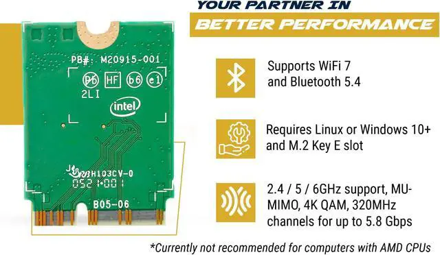 Compatibility: Fits systems with M.2 PCIe WiFi Card slots with Key E running Windows 10 or 11. Ideal match for WiFi 7 or WiFi 6E router for unmatched performace among internal computer networking cards