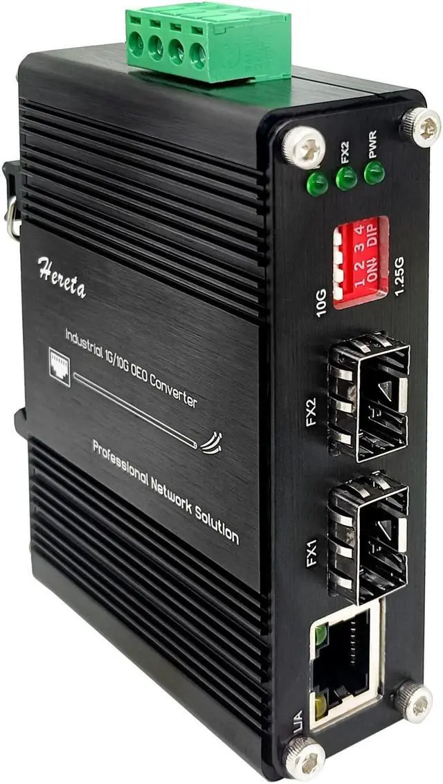Industrial 10G SFP+ to SFP+ Ethernet Fiber Media Converter,10G OEO 3R Repeater Copper Fiber Extender up to 120km,2 x Open SFP+ + 1 x RJ45 Port,IP40,DIP Swicth,6KV Lightning Protection,12~48V DC Input