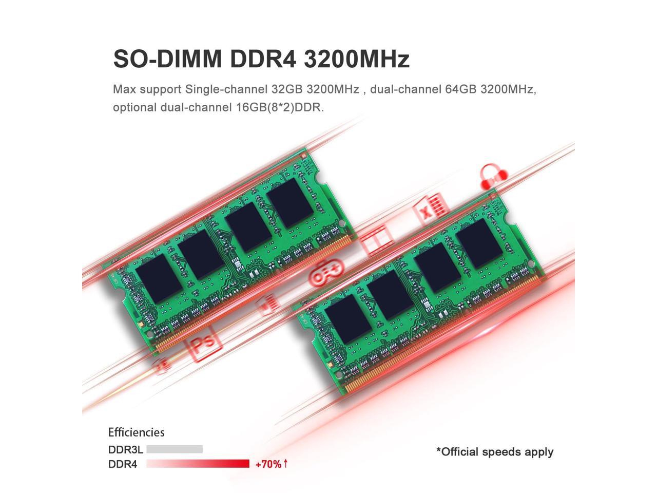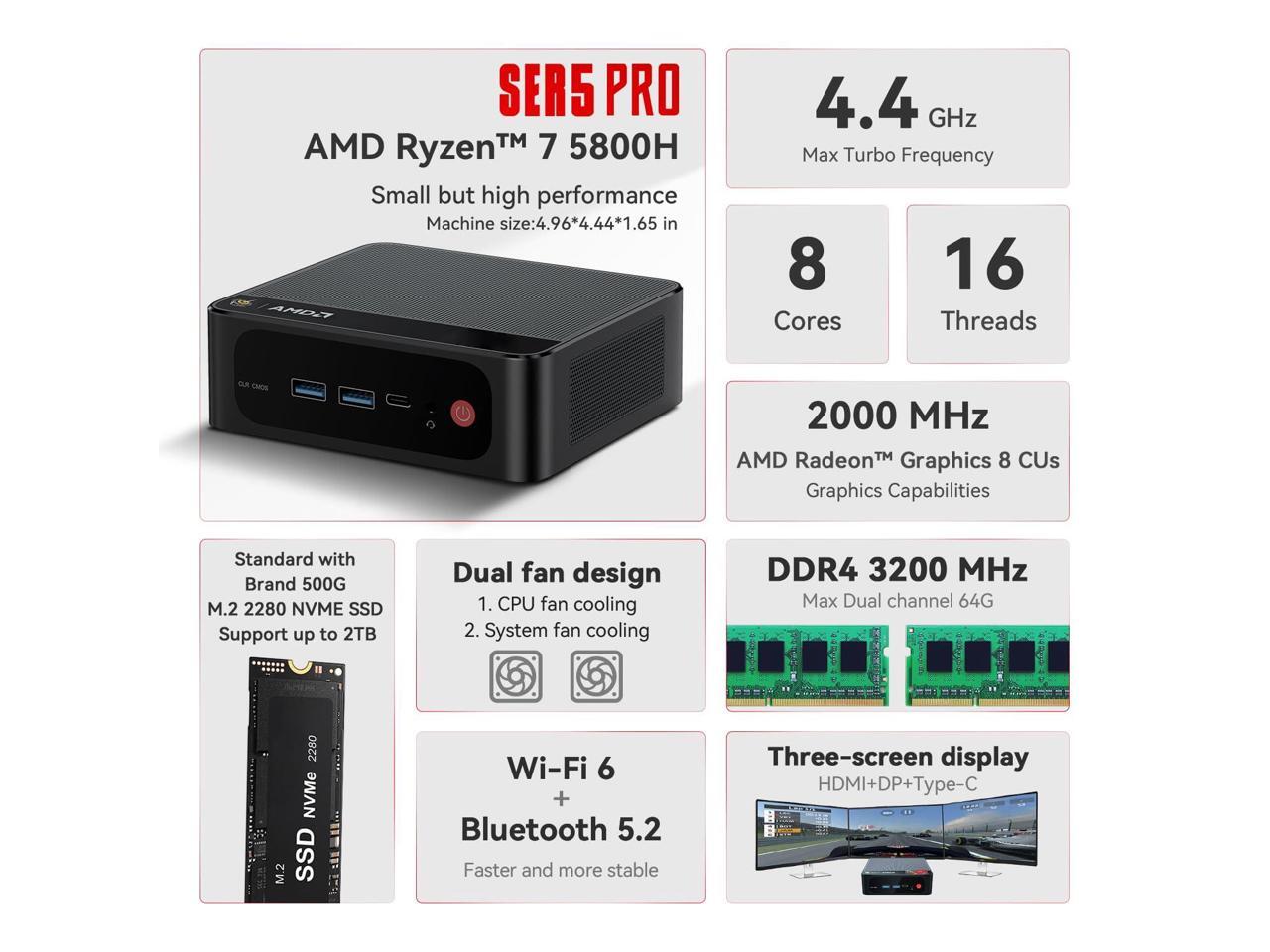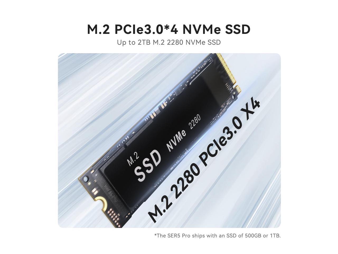 - Larger + Faster + Expandable Capacity - SER5 Pro mini pc comes with 16GB SO-DIMM DDR4 RAM(2 x 8GB, 3200MHz). Dual channel SO-DIMM DDR4 upgradeable to max 64GB(2 x 32GB). 500GB M.2 NVMe PCIe3.0 X4 2280 SSD(upgradeable to max 2TB), reading speed up to 3000mb/s and writing speed up to 15