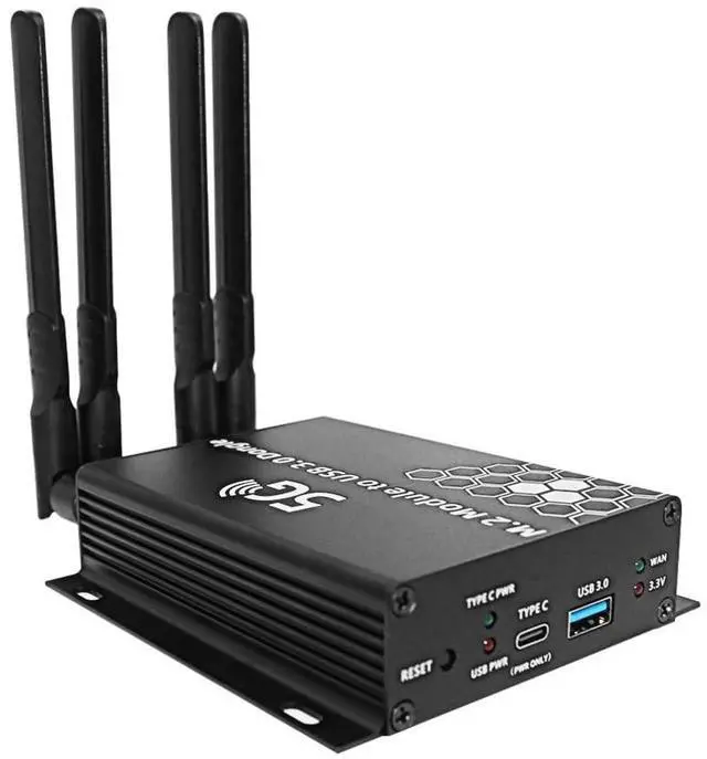 Package contents: 1x M. 2 to USB 3.0 adapter2x M2 Screw4x M 2.5 screw1x screwdriver4x 2.4G /5G antenna1x USB 3.0 cable1x SIM Card Extension Kit1x Type C cable1x 4010 DC fan