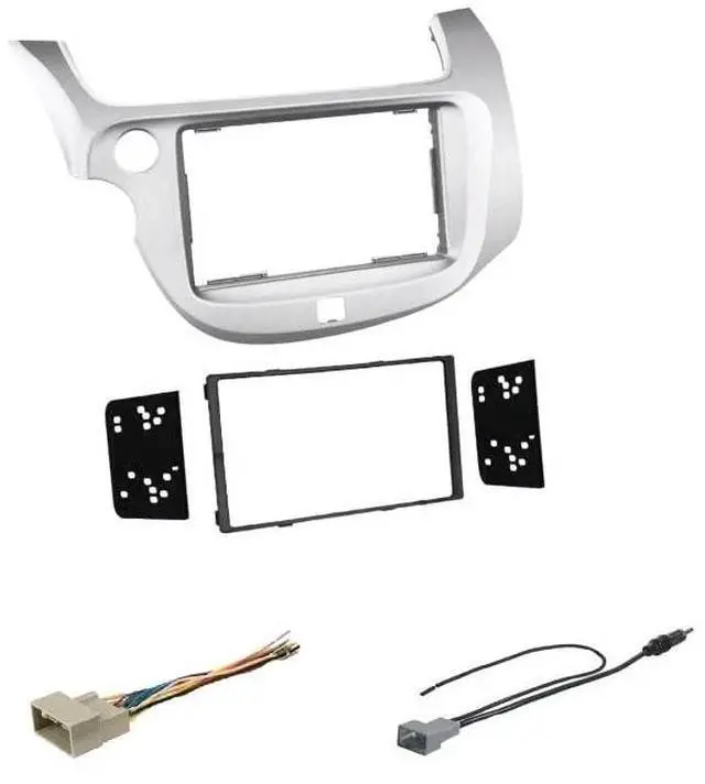 Radio Dash kit, wire harness, and antenna adapter for installing an aftermarket radio. Dash kit has a silver finish. Dash kit works with a Double Din size radio. Some off brand radios that are off size might not fit properly. Using major popular brands like Kenwood, Alpine, Pioneer, etc is recommended. Will not retain some features like steering audio controls etc.