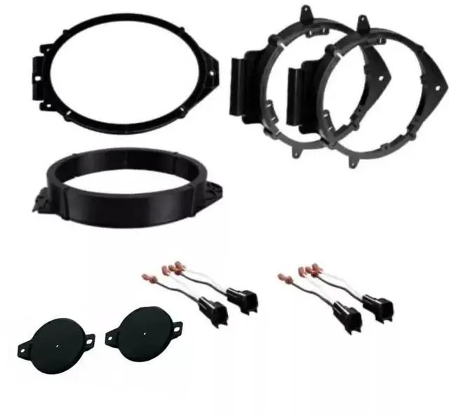 Use to add aftermarket speakers to factory door locations. Water resistant sturdy plastic. Includes 2 pairs for 4 doors- 4 speaker plates, 2 tweeter plates and 4 speaker wire harness. Front are for 6x9 speakers and backs are for 6"/ 6.5" speakers.