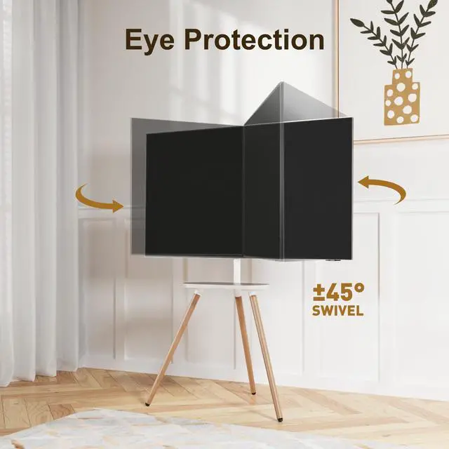 [(Enjoy comfortable Views)] By using the ergonomic height adjustment function, you can adjust the TV to the correct level for your eyes. This TV tripod stand's bracket allows for a 45 degree left and right swivel, which could prevent light reflections. An swievel TV stand is beneficial in preventing painful in your eyes and neck muscles for long time.