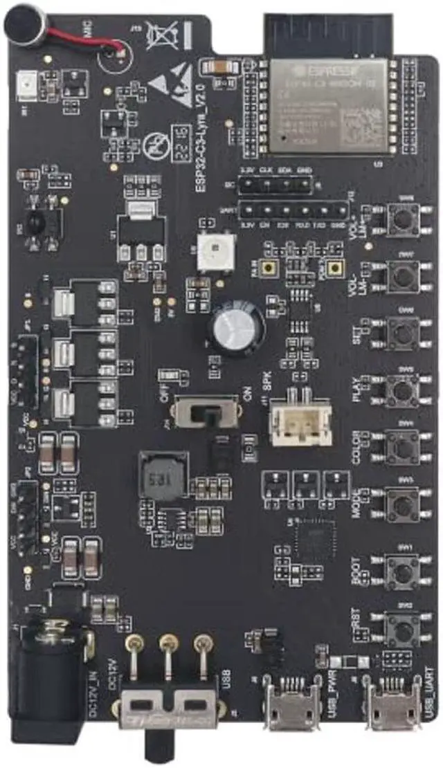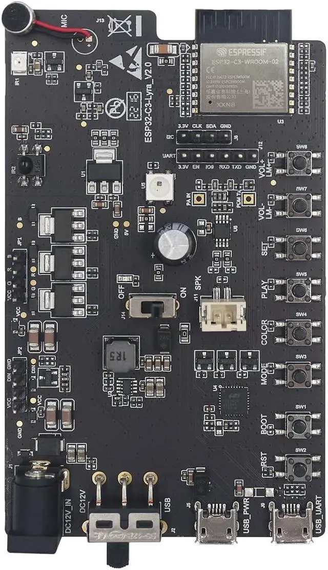 ESP32-C3-Lyra is an ESP32-C3-based audio development board produced by Espressif for controlling light with audio. The board has control over the microphone, speaker, and LED strip, perfectly matching customers' product development needs for ultra-low-cost and high-performance audio broadcasters and rhythm light strips.