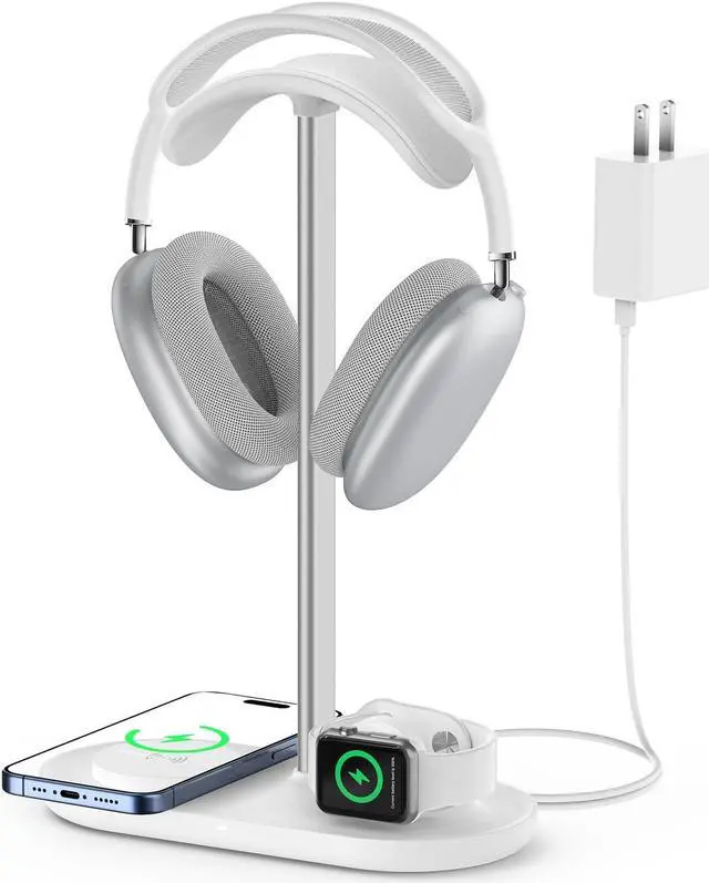 HiWe 3-in-1 Headphone Stand - Universal Desktop Gaming Headset Holder with Wireless Charger for Phones/AirPods/iWatch, Aluminum Alloy Rod, Leather Pad, ABS Solid Base, White