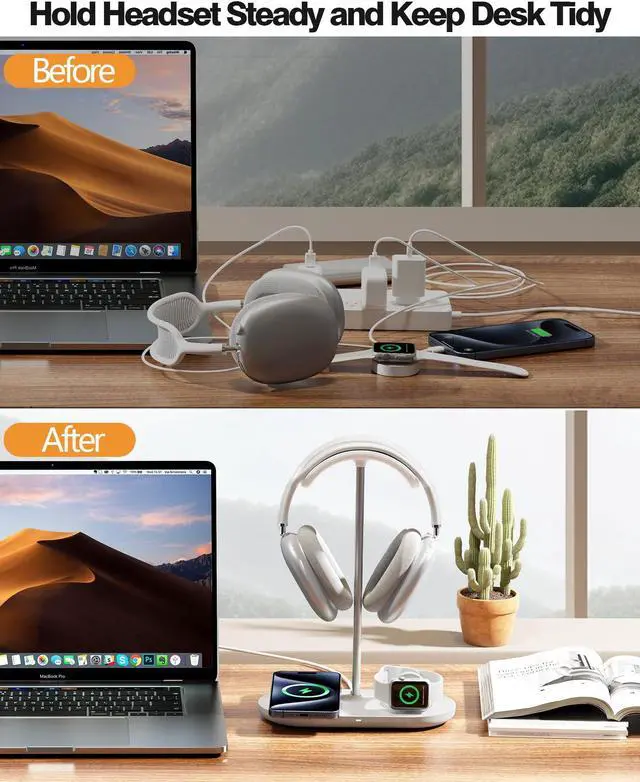 [(Ideal Gift and Desk Charge Stand)] :Combining form and function, this minimalist 3-in-1 headphone stand is the epitome of taste and practicality, serving as a perfect gift for individuals valuing both style and orderliness. By efficiently reducing desktop charging chaos, it seamlessly transforms your desk space into a clutter-free haven for focused work, immersive gaming, or peaceful relaxation. Suitable for working desk, bedside table, gaming desk, etc.