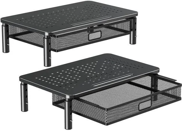 Sturdy Metal Stand Riser - This monitor stand riser is of high-quality manufacturing and materials. It can hold up to 44 lbs and is sturdy enough to ensure the stability of your monitor, computer, PC, printer, or books. ^^ Super Easy Assembly - Simply screw the four legs into the platform by hand, then insert the drawer and the installation is completed so that you can get to work quickly and make it more comfortable and effective. The top plate and drawer are made of mesh steel for better airflow and keeping cool of the electronics.