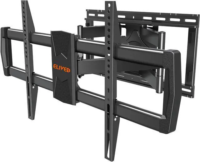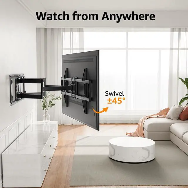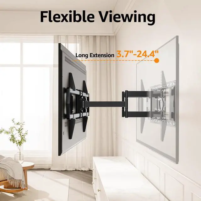 Wide Compatibility - This wall TV mount is ideal for most 42-90 inch flat and curved TVs up to 200 LBS with VESA (TV mounting holes) from 150x100mm(6x4") to 800x400mm(32x16"), fitting up to 24" wood studs spacing. Please check the TV weight, VESA, wood studs spacing and input access before purchase ^^ Long Extension Arms - The articulating TV mount fully extend out 24.4" to bring TV closer and retract back against the wall 3.7" for space-saving. The long extension feature is a great solution for large rooms to cover multiple viewing positions ^^ Flexible Viewing Angle - TV wall bracket can tilt +5/-10 to reduce screen glare, swivel left or right 45 to optimize your viewing experience, and has +1/-1 screen level adjustment after installation ^^ Preassembled - Large TV mount features with one-piece design without assembly, including bubble level and mounting template to save your effort for quick and easy installation.