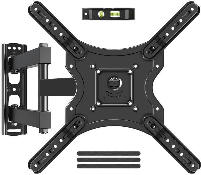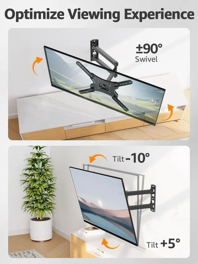 Universal TV Mount - This full motion TV mount fits most 26-60 inch TVs with vesa patterns range from 75x75mm (3x3) to 400x400mm (16x16) and holds up to 77 lbs. /35kg. Please Check TV weight, size, vesa, and input access before purchase. ^^ Full Motion for Customized Viewing Angle - The articulating TV mount allows +/-90swivel (max swivel angle depends on TV size) to provide full-motion adjustment capacity for ideal viewing. You can tilt angle ranging from +5to -10to reduce glare from lights and extends up 15.6" to get more comforts from any seat in the room, and +/-5level adjust for maximum viewing flexibility, no more neck or back pain! ^^ Heavy Duty & Durable & Sturdy - The strong articulating 3-arm structure with cold-rolled steel ensures reliable strength and provides you sufficient swivel angle.