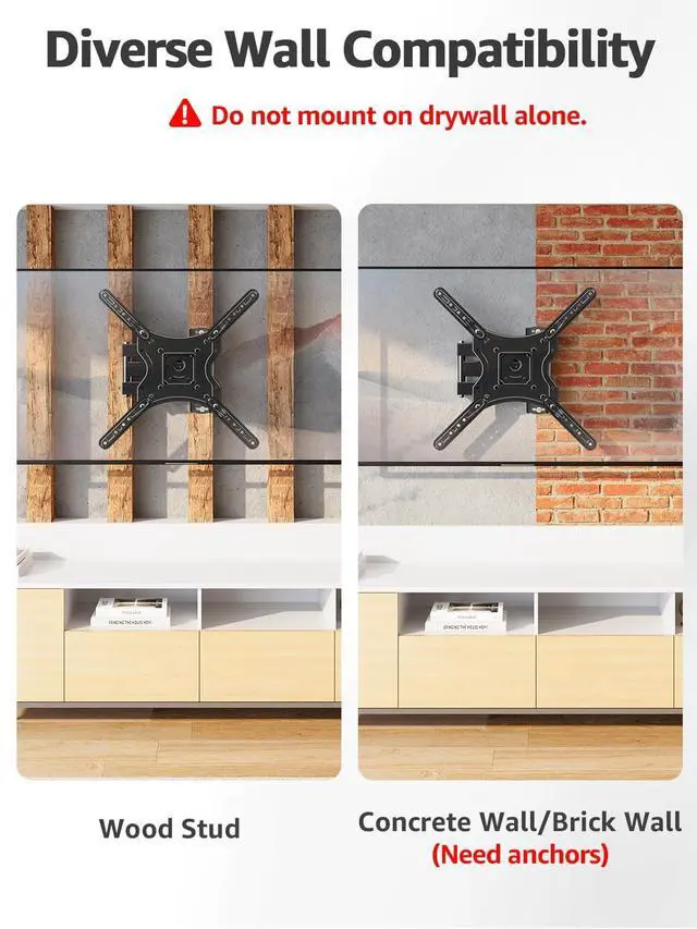 Note: Do Not install into drywall alone. ^^ Perfect for homes, offices, and commercial settings, it fits widely in living rooms, bedrooms, home theaters, conference rooms, hotels, and cafes, our multi-functional TV wall mount offers tilt, swivel & extension for ideal viewing. Space-saving, sturdy & fits most TVs.