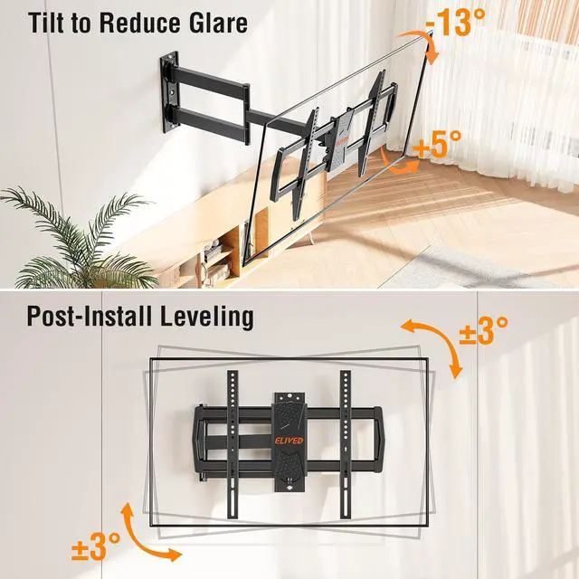 Ultimate Viewing Experience: The full motion TV wall mount can swivel left or right 90 to cover different viewing area, tilts +5/-13 to reduce glare, and screen level+3/-3 after installation ^^ Ideal for
