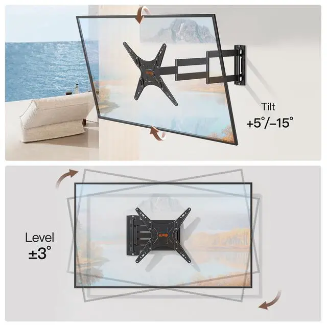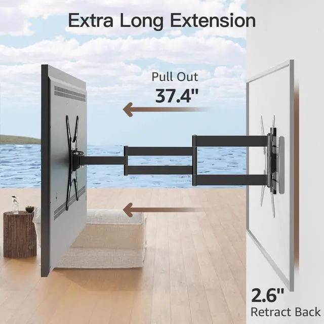 37.4" Long Extension TV Mount - This extra long extension TV wall mount can extend 37.4 from wall to cover more viewing positions. This long arm TV mount can retract 3 to wall for saving space and a clean look. It is an ideal choice for corner placement and you can watch TV anywhere you want. ^^ Versatile Compatibility - This full motion TV mount fits most 26-65 inch TVs with VESA patterns range from 100x100mm (4x4) to 400x400mm (16x16) and holds up to 77 lbs. /35kg. Please Check TV weight, size, vesa, and input access before purchase.