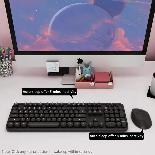 Wireless Keyboard and Mouse Combo, Cute Full Size 104-Key Typewriter Retro Round Keycaps Keyboard for PC Laptop,Windows,Desktop,Perfer for Home and Office Keyboards (Black)