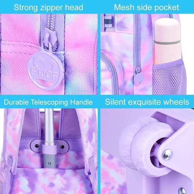 Unique Wheel Backpack: The stylish front buckle design with purple tie-dye print, allows you to hang hats or dolls. Available in a variety of colours, this rolling backpack is a great choice.