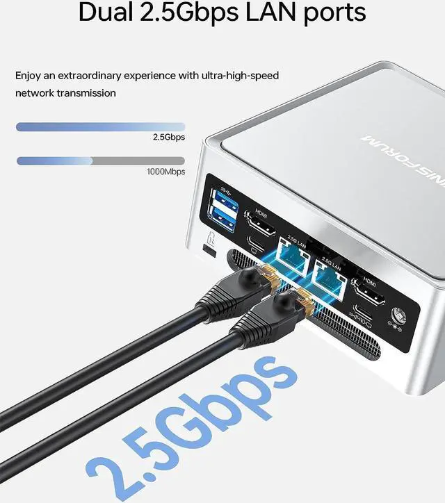 [(Dual LAN 2.5G)] MINISFORUM NAB6 Lite small pc with two 2.5 Gigabit Ethernet(Intel i226v) ports provides more applications, such as firewalls, multichannel aggregation, file storage servers, etc. At the same time, dual-band Wi-Fi6, BT5.2 with more substantial resisting disturbance and more stable wireless signal. No matter how complicated your environment, NAB6 Lite mini desktop computers can provide a relatively stable and smooth network.