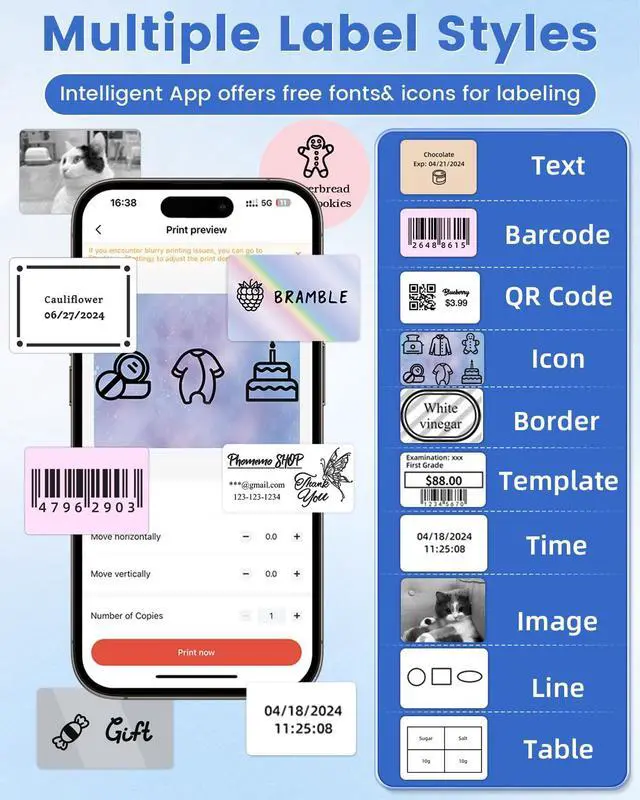 Large Printing Width: Phomemo M150 Bluetooth sticker printer can print thermal labels with a width of 0.78"-1.96" (20-50mm). Phomemo M150 barcode label printer can use white, color, and transparent labels. You can use the functions of Text, Images, Excel, QR Code, and Barcode in the Print Master App to freely create food labels, ingredient labels, clothing labels, address labels, etc