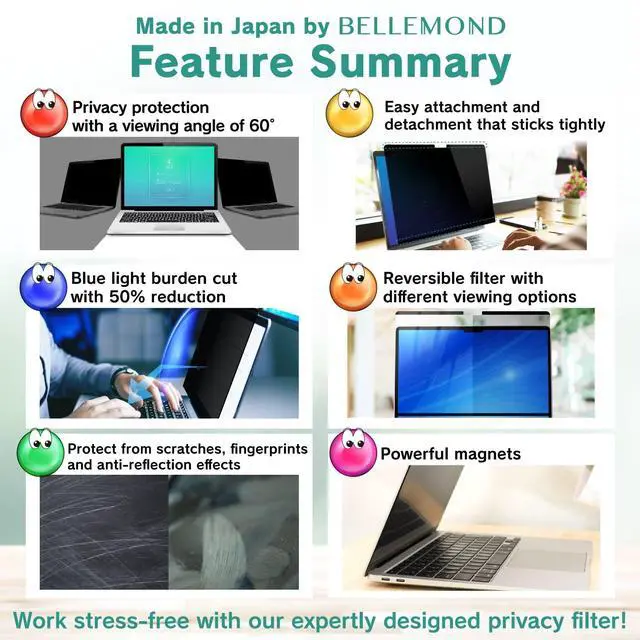 [(INTERNATIONALLY ACCLAIMED)] - BELLEMOND's Screen Protectors, proudly made in Japan, have received widespread recognition for their exceptional quality. Our MacBook Privacy Screen Filter is perfect for travel and open workspaces, making it an ideal solution for healthcare providers, mobile workers, commuters, students, and business travelers. Safeguard your sensitive information while working in airplanes, subways, airports, and public areas.
