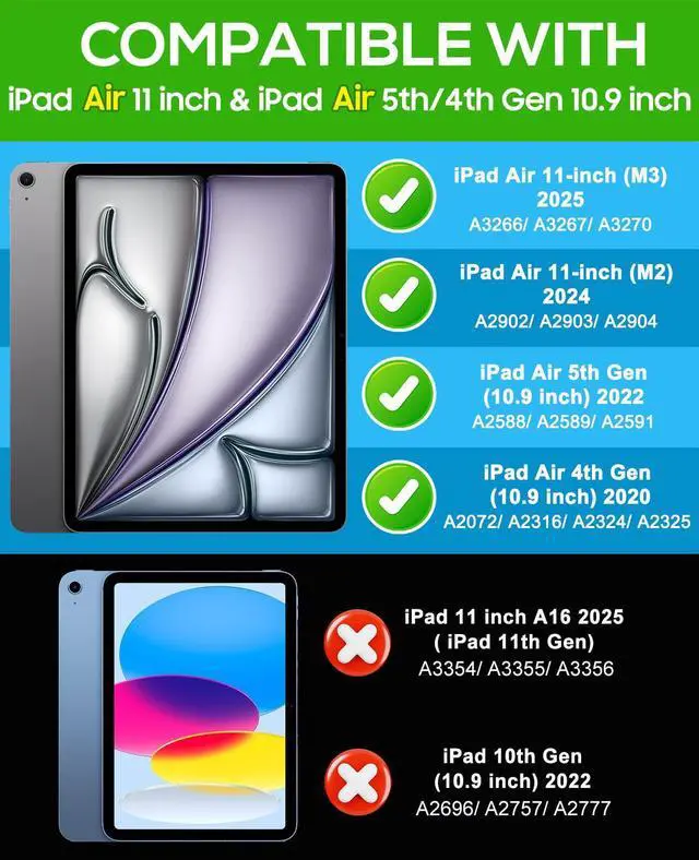 Compatible Models: This case design for new iPad Air 11-inch (M2) 2024 (Model: A2902/A2903/A2904), iPad Air 5th Generation 2022 (Model : A2588/A2589/A2591), iPad Air 4th Generation 2020 (Model: A2072/A2316/A2324/A2325) 10.9 Inch Tablet