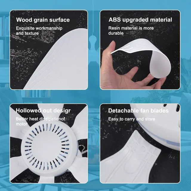 Small ceiling fan great for hot summer and windless day, For smaller space indoor outdoor RV dormitory bed room desk travel camping tent canopy cubicle etc.Easy to install and portable,It has 6 detachable leaves,Easy to install and disassemble,Small and lightweight, Disassemble it and put it into the backpack, occupying a small space.