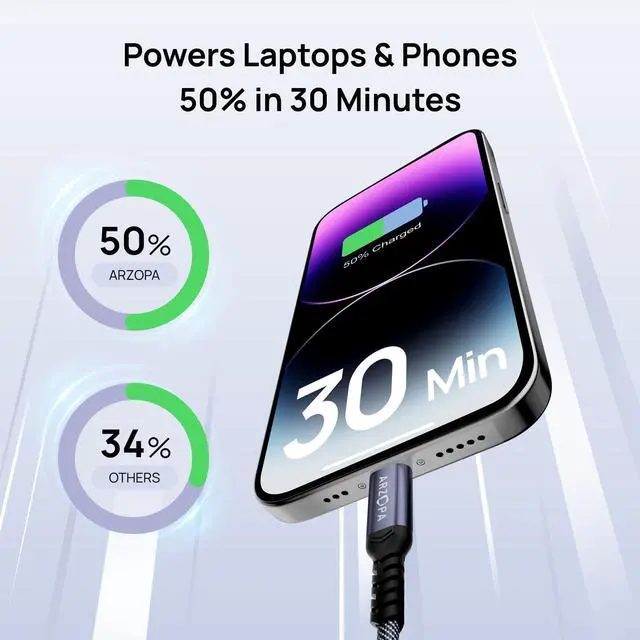 100W Power Delivery Fast Charging:This USB-C cable supports 100W PD charging, capable of charging an iPhone 16/15 Pro to 50% in approximately 30 minutes. It provides efficient charging for MacBook Pro/Air, iPad Pro, and other USB-C compatible devices.