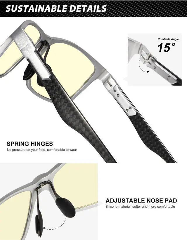 Premium Temple Material: With superior Al-Mg and carbon fiber composite temple, this type of blue light blocking glasses for men is ultra-light than pure metal frame, also more sturdy. No more worries about broken temples. As more suitable for anyone who often work or play games by the computer, do not miss this pair of practical and classic blue blocker glasses.