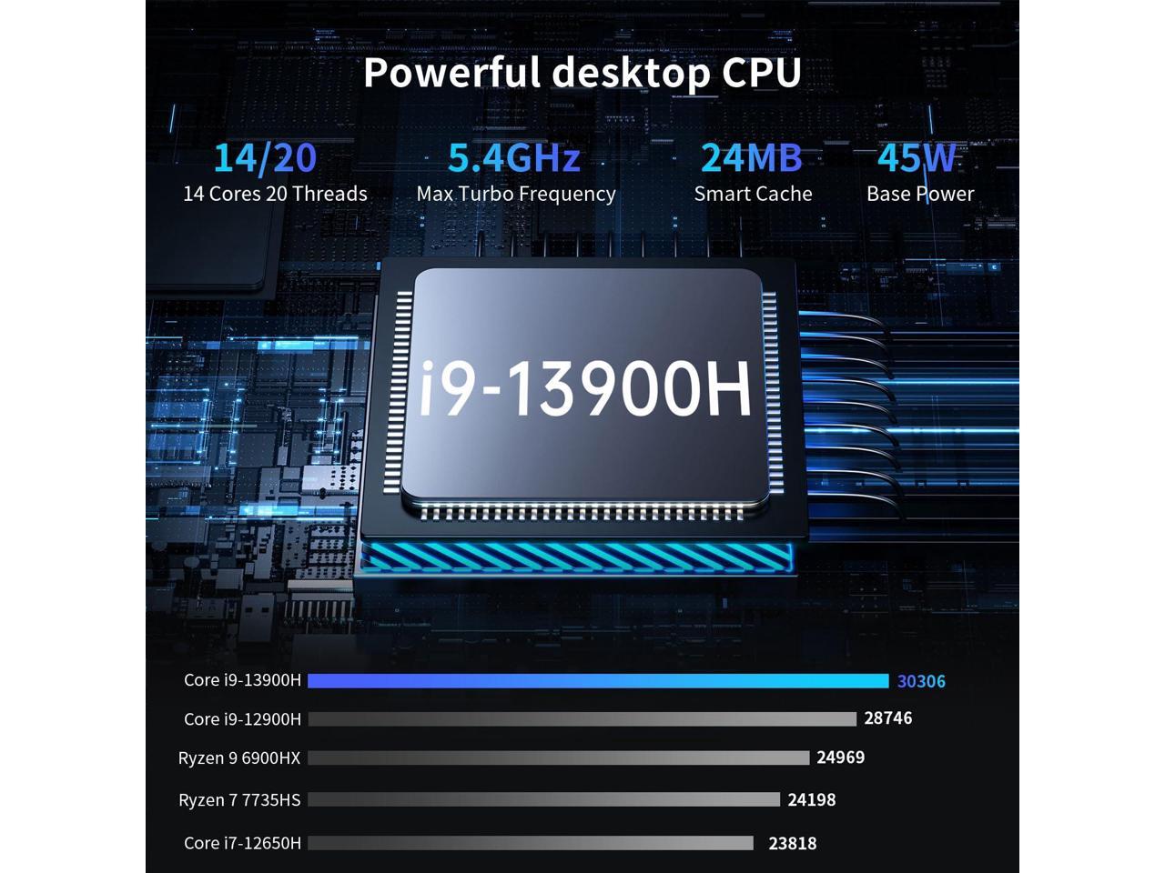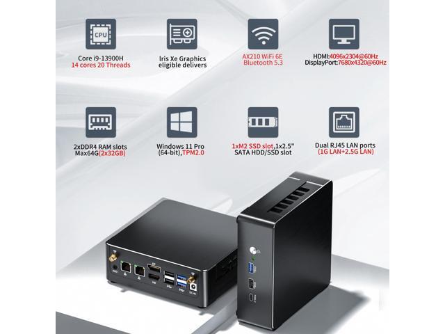 - High Performance: Mini PC equipped with Core i9-13900H processor, 14 cores 20 threads, 24M smart Cache, Max Turbo Frequency: 5.4GHz. This mini-computer is Pre-installed with Windows 11 Pro (64bit) OS, Built-in Intel AX210 WiFi6E, Bluetooth 5.3, Compared to wifi6, the 6GHz band has been added for better anti-interference capability and faster transmission rate. Mini PC is ideal for such as Home Entertainment, Design, Office, Online Education, Industry, etc.