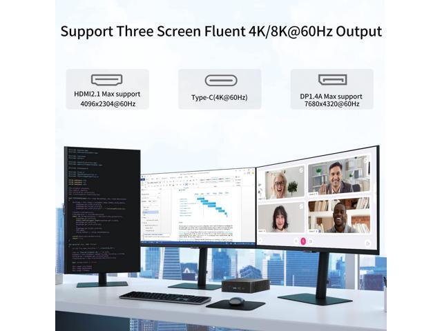 - UHD Three-Display: Featuring the built-in Intel Iris Xe Graphics (Graphics frequency 1.45 GHz) with Xe architecture. Mini PC supports easy connection to three-monitors via HDMI2.1+USB-C+DP1.4, S