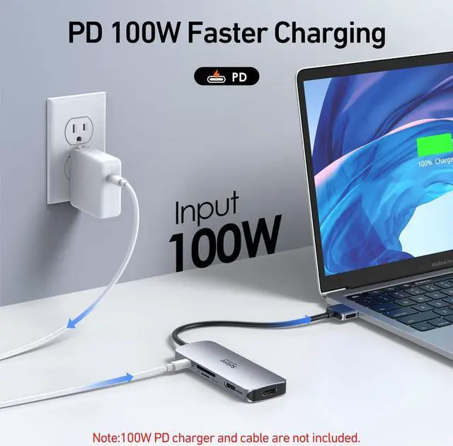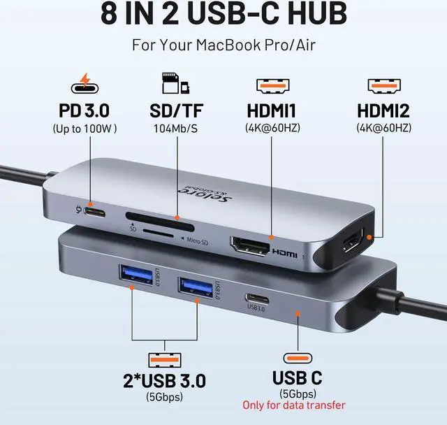 [8 IN 2 USB C Hub for Macbook Pro Air] The usb c adapter for macbook equipped 2 hdmi,1 usb c ,2 usb a,100W pd,sd/tf card reader,It is the most convenient devices for you to solve the issue of macbook external ports,you could transform 2 usb c ports of macbook to 8 functional ports,suitable for home and office use for effective work