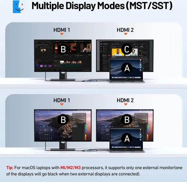 [Dual 4K Display for Macbook Pro Air] Selore docking station for macbook pro air through 2 usb c ports extend to dual hdmi display up to 4K@30hz,the usb c hub for macbook support MST and SST on macbook which permitted to extend different pictures on 2 extra monitors(M1,M2,M3 chip only support 1 extra monitors,while 2 extra monitors are connected,1 monitor will go black)