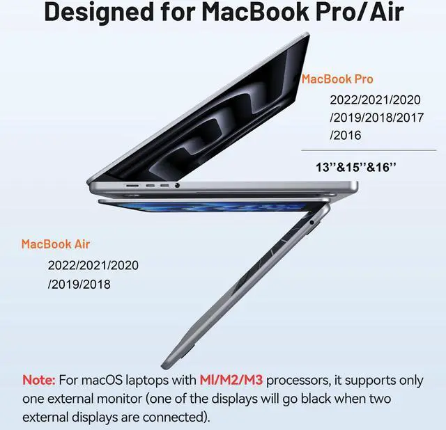 [Upgrade Docking Station for Macbook] This docking station dual monitor designed for macbook all models, dual usb c male ports design let this hdmi adapter works for 13'' 14 ''15'' 16'' inch macbook pro 2017 ,2018,2019,2020,2021.etc. And macbook air 2023,2022,2021,2020.etc.If