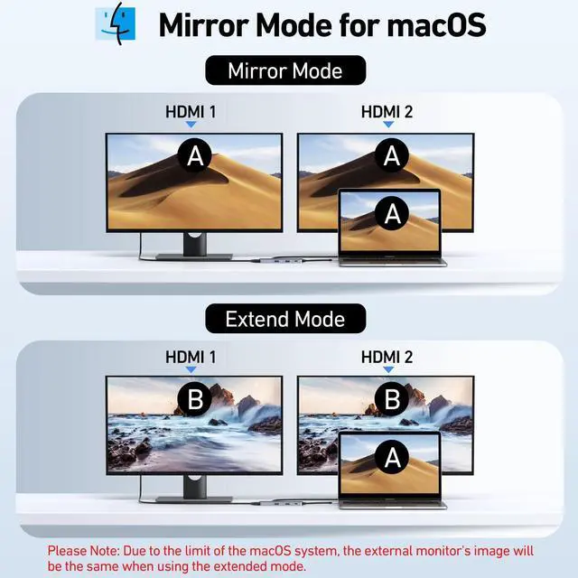 [Dual Monitors Made Easy for DP1.4 Laptop] Please note: Only mirror(SST) mode (identical screens of external monitors) is supported on MacOS system,Extended mode(MST) is not supported.With our advanced intelligent technology, the 2 HDMI to USB C adapter provides temperature control and stable performance. Boost productivity with our usb c dual hdmi supporting MST mode under Windows Laptop for extending two monitors simultaneously