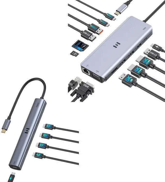 Enhanced 13-in-1 Connectivity: The Selore Multi-Monitor Hub features 13 ports, including dual HDMI ports with 4K/60Hz output, a DisplayPort supporting 8K/30Hz, a VGA port at 1080p/60Hz, 10Gbps USB-A and USB-C data ports, a 100W Charging port and an RJ45 Ethernet port with 1000Mbps speed, SD/Micro SD Slot