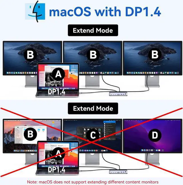 4K@144Hz/120Hz Dock: Windows single 4K@144Hz (DP1.4) & macOS 4K@120Hz (M1-M4 chips). Multi-display requires lower res. Note: 4K@144Hz limited to single monitor; multiple displays disable other outputs.
