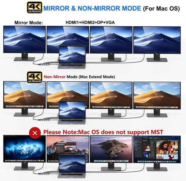 Docking Station Dual Monitor :If you are mac os system laptop,please carefully check the dual display description. Attention: On Mac devices, ONLY Mirror Mode, CAN NOT extend two different Screen, due to Mac OS limitation; Connect device with USB Type C (tunderbolt 3) port to two external monitors.You can enjoy movies,games with your families on external ultra HD big screen; ON Windows this usb c dual hdmi adapter support SST and