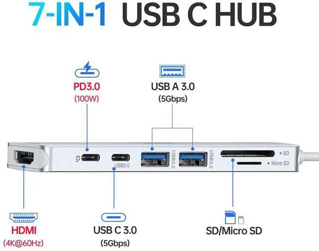 7-in-1 USB C Hub: USB C to HDMI Adapter equipped with 1*4K@60Hz HDMI port, 2*USB 3.0 ports, 1*USB C Data port, 1*100W PD, Micro SD/TF card reader slot, Works well with most USB-C devices, like MacBook Pro, MacBook Air, MacBook M1, M2, iMac, iPad Pro, iPhone 15 Pro/Pro Max, Dell XPS Surface, HP and other USB-C port devices