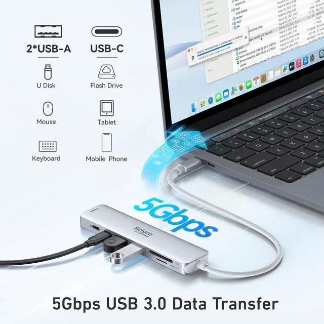 Super Speed USB 3.0 Ports: USB C Hub Multiport Adapters allow you to connect keyboard, mouse, hard drive, etc to MacBook Pro, up to 5Gbps data transmission speed, down compatible with USB A 2.0 and below. Because HDD/SDD needs more power, so it only allows connect 1 HDD/SSD and this adapter won't support Apple USB super drive