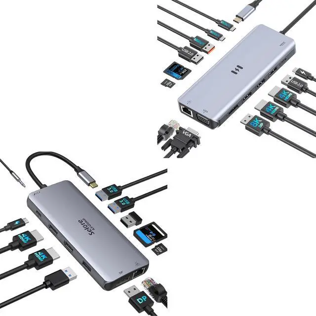 Connectivity: The Selore Multi-Monitor Hub features 13 ports, including dual HDMI ports with 4K/60Hz output, a DisplayPort supporting 8K/30Hz, a VGA port at 1080p/60Hz, 10Gbps USB-A and USB-C data ports, a 100W Charging port and an RJ45 Ethernet port with 1000Mbps speed, SD/Micro SD Slot ^^ 12 IN 1