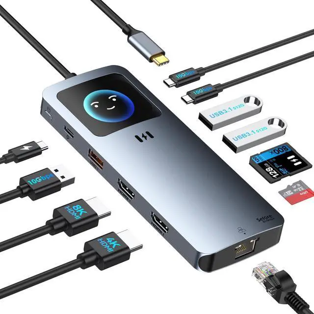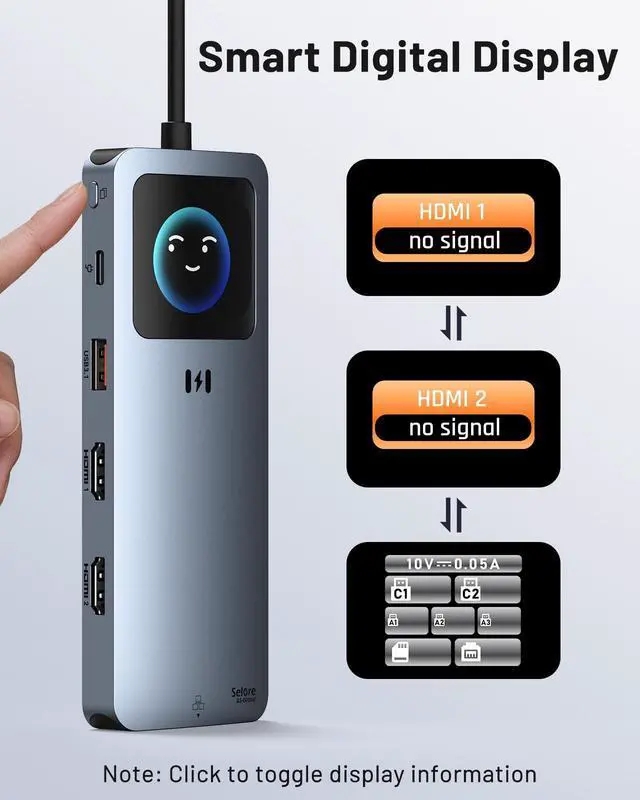 Docking Station Dual Monitor: The HDMI docking station features with USB A/C, 100W PD, Gigabit Ethernet, SD/TF card slot and 2*4KHDMI, it effortlessly connects all your peripherals in one go. And laptop hub features an innovative integrated LCD screen for intuitive monitoring of real-time data such as charging status and resolution. With one-touch switching, intelligently manage the status of each port ^^ Built-in LCD for Real-Time