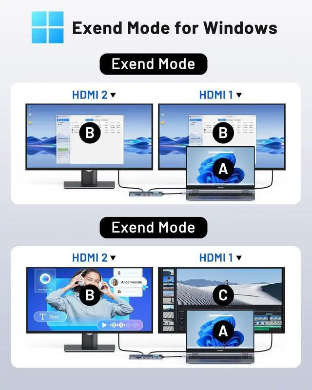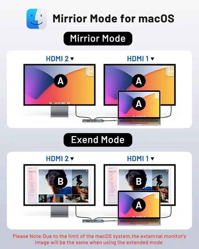 Mac Users: This docking station dual monitor HDMI only supports mirror mode (repeated display), dual screen extension with two different screens (MST) is not available on macOS! Boost productivity with our USB C dual HDMI supporting MST mode under Windows Laptop for extending two monitors simultaneously ^^ Super